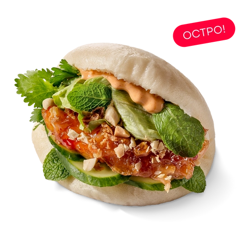 Паровая булочка бао, курица в темпуре, огурец, салат айсберг, лук фри, молотый арахис, мята, кинза, соус сладкий чили, соус азиан