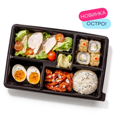 Ролл Сливочная креветка в стружке тунца (1/2) / Салат с курицей су-вид, айсбергом, черри и кунжутным соусом / Курица по-сеульски с рисом (1/2) / Яйцо адзитама / Имбирь / Васаби