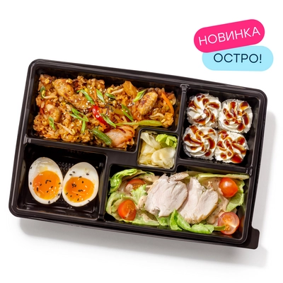 Ролл Венеция (1/2) / Салат с курицей су-вид, айсбергом, черри и кунжутным соусом / Фирменный Вок Рис Кимчи с курицей (1/2) / Яйцо адзитама / Имбирь / Васаби