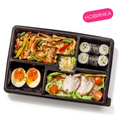 Ролл Огурец / Салат с курицей су-вид, айсбергом, черри и кунжутным соусом / Вок Лапша с курицей в соусе терияки (1/2) / Яйцо адзитама / Имбирь / Васаби
