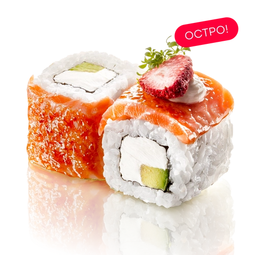 Лосось, сливочный сыр, клубника дегидрированная, авокадо, соус спайс, сахар тростниковый, микрозелень, нори, рис заправленный