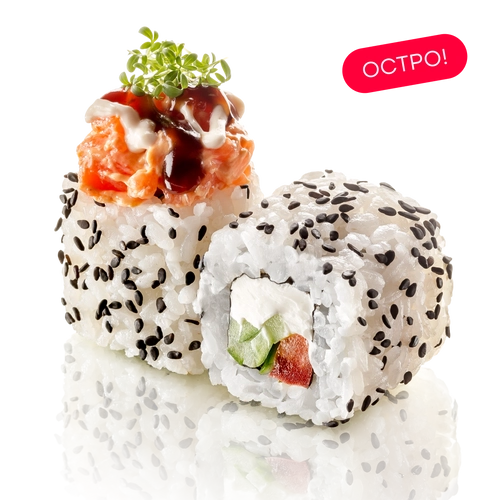 Лосось, сливочный сыр, огурец, томат, соус Том ям, соус унаги, соус трюфельный, нори, рис заправленный, кунжут, микрозелень