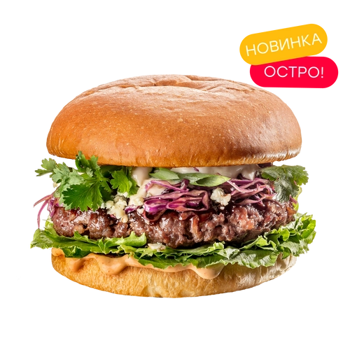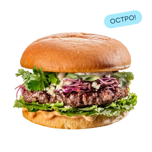 Булочка бриошь, котлета из мраморной говядины, салат айсберг, дорблю, азиатская капуста, зеленый лук, кинза, соус хойсин, соус трюфельный, соус малазийский