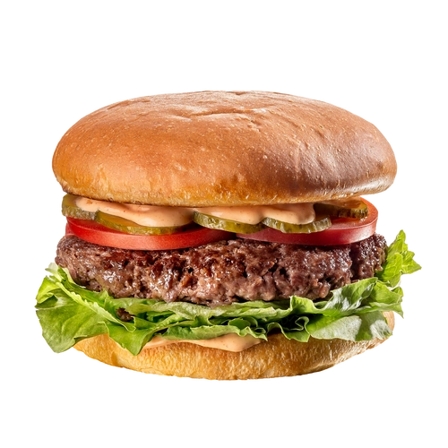 Булочка бриошь, котлета из мраморной говядины, салат айсберг, томат, маринованные огурцы, соус бургер
