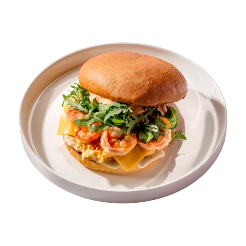 Булочка бриошь, тигровая креветка, скрэмбл, сыр, микс салат, соус трюфельный, соус спайси