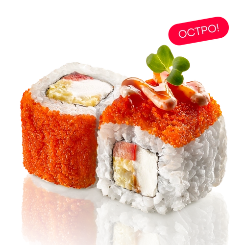 Сливочный сыр, тамаго, помидор, икра тобико, соус масаго, соус манго-чили, микрозелень, нори, рис заправленный