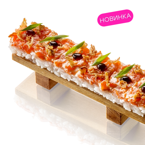 Лосось, икра тобико, соус майо, соус унаги, лук фри, лук зеленый, рис заправленный