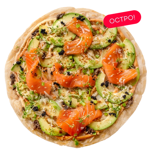 Лепешка роти, лосось, авокадо, моцарелла, пармезан, черный трюфель, соус трюфельный, соус спайси, зеленый лук, авторский кунжут кимчи, икра тобико, микрозелень
