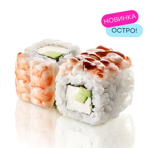 Креветка, сливочный сыр, огурец, соус спайс, соус унаги, нори, рис заправленный