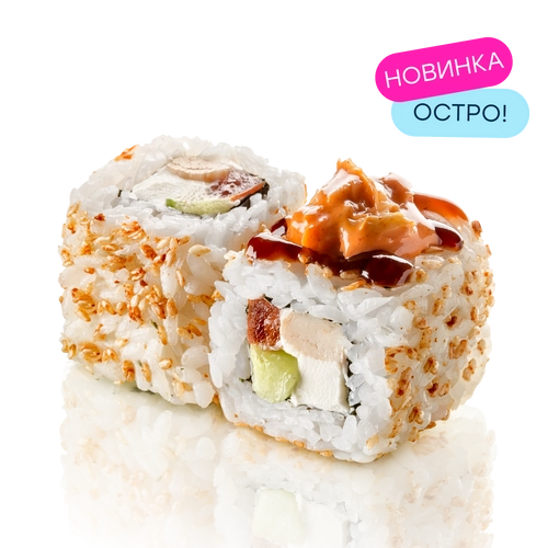 Курица, сливочный сыр, огурец, помидор, крем кимчи, кунжут кимчи, соус унаги, нори, рис заправленный