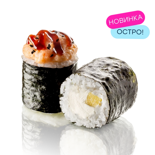 Креветка, сливочный сыр, омлет тамаго, соус унаги, соус спайси, нори, рис заправленный
