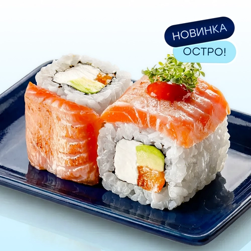 Лосось, сливочный сыр, авокадо, хурма, соус шрирача, микрозелень, нори, рис заправленный