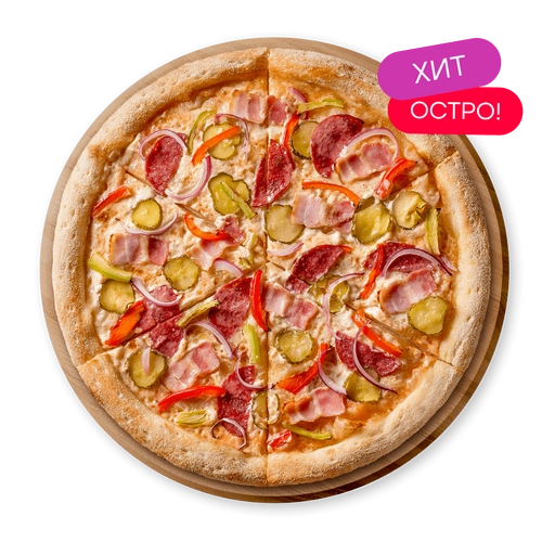 Сливочный соус, соус чили, бекон, салями, маринованные огурцы, красный лук, болгарский перец