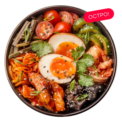 Курица, рис гохан, помидоры черри, пекинская капуста кимчи, огурцы кимчи, морковь по-корейски, папоротник маринованный, грибы древесные маринованные, яйцо адзитама, сеульский соус, зеленый лук, кунжут, кинза, соус никкей