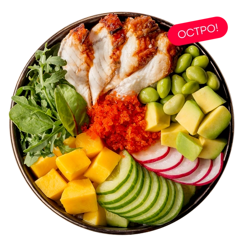 Угорь, рис, бобы эдамаме, огурец, редис, манго, авокадо, масаго, кунжут, салат микс, соус ореховый, соус спайс нью, соус никкей
