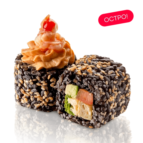 Креветка гриль в соусе чили, авокадо, томат, омлет тамаго, зеленый лук, авторский кунжут кимчи, чернила каракатицы, фирменный соус том-ям, тайский соус шрирача, соус спайси, нори, рис заправленный