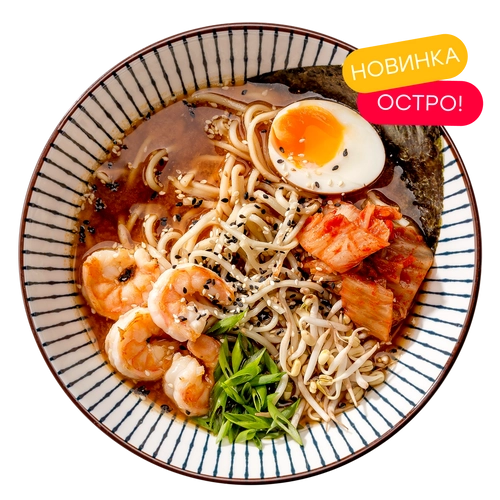 Бульон кимчи, пшеничная лапша, маринованное яйцо, капуста кимчи, зелёный лук, ростки сои, кунжуn