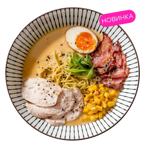 Сырный бульон, пшеничная лапша, жареный бекон, маринованное яйцо, кукуруза, зеленый лук, кунжут