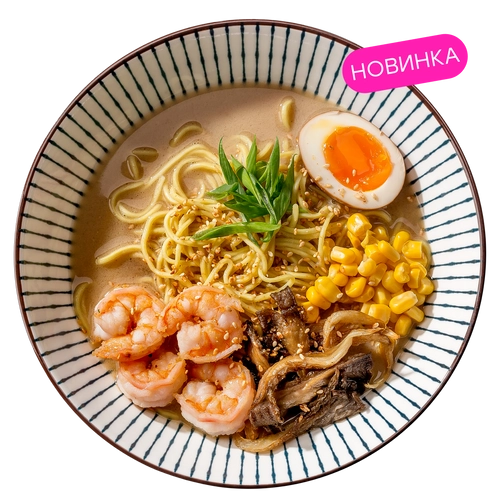 Куриный бульон, пшеничная лапша, маринованное яйцо, вешенки, кукуруза, зеленый лук, авторский кунжут кимчи