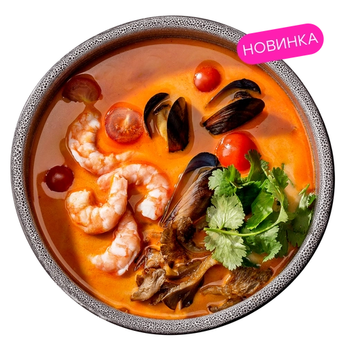 Бульон Том Ям, креветки, мидии, вешенки, томаты черри, кинза, зелёный лук, перец чили, кунжут, рис заправленный