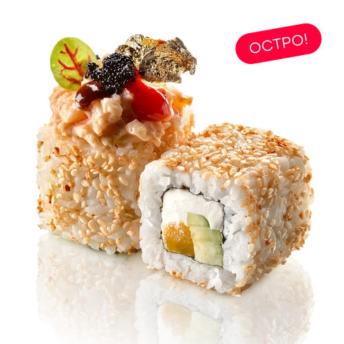 Креветка, сливочный сыр, манго, огурец, пищевое золото, кунжут кимчи, соус спайс нью, соус шрирача, соус унаги, икра тобико, микрозелень, нори, рис заправленный