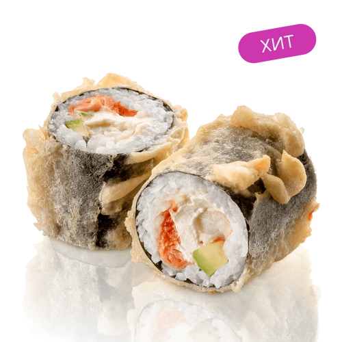 Тигровая креветка, лосось, сливочный сыр, авокадо, кляр, нори, рис заправленный