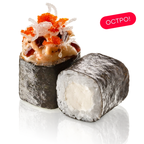 Тигровая креветка, сливочный сыр, икра тобико, фунчоза фри, майонез, соус спайси, соус унаги, нори, рис заправленный
