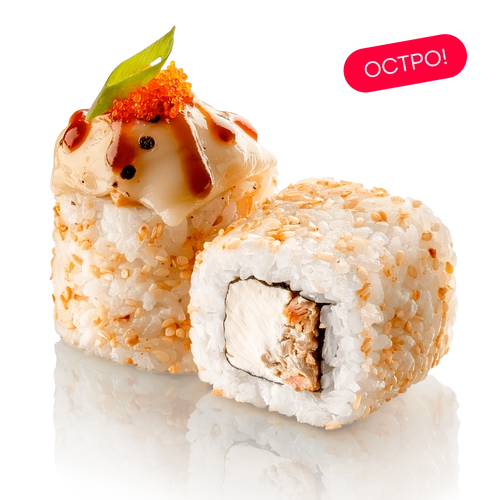 Лосось-гриль в азиатском соусе, филе белых рыб, два вида сыра, икра тобико, зеленый лук, авторский кунжут кимчи, соус унаги, соус спайси, нори, рис заправленный