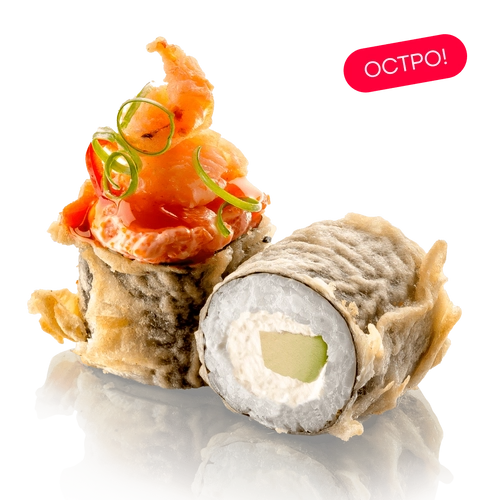 Креветка в темпуре, лосось, сливочный сыр, авокадо, икра тобико, соус сладкий чили, лук зеленый, майонез, перец чили, кляр, нори, рис заправленный