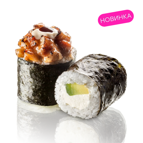 Угорь, сливочный сыр, авокадо, соус унаги, соус спайси, соус трюфельный, нори, рис заправленный