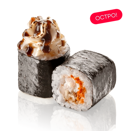 Тигровая креветка, угорь, сливочный сыр, икра тобико, соус спайси, соус унаги, нори, рис заправленный
