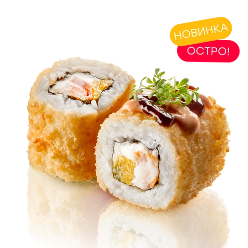 Креветка, сливочный сыр, манго, соус спайси, соус унаги, микрозелень, сухари панко, кляр, нори, рис заправленный