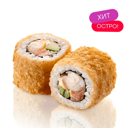 Тигровая креветка, бекон, авокадо, сухари панко, кляр, соус спайси, нори, рис заправленный