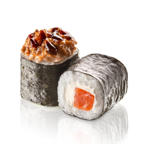 Лосось, грибы шиитаке, сливочный сыр, икра тобико, майонез, соус унаги, нори, рис заправленный