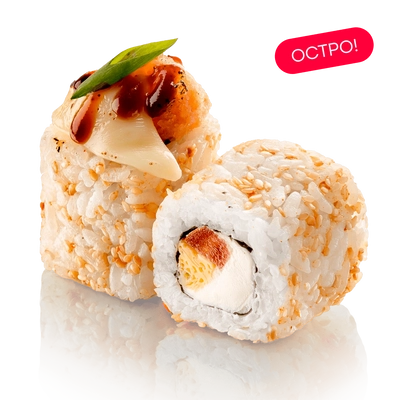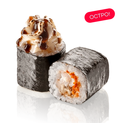 Тигровая креветка, грибы шиитаке, сливочный сыр, икра тобико, авокадо, соус масаго (майонез, масаго оранжевая), соус унаги, нори, рис заправленный