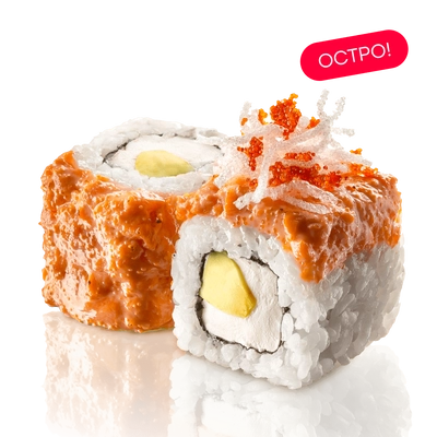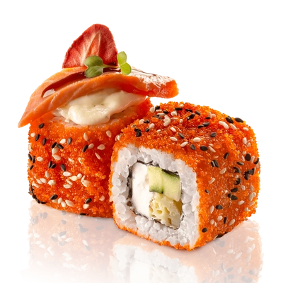 Лосось, сливочный сыр, икра тобико, авокадо, фунчоза фри, соус масаго (майонез, масаго оранжевая), соус спайси, нори, рис заправленный