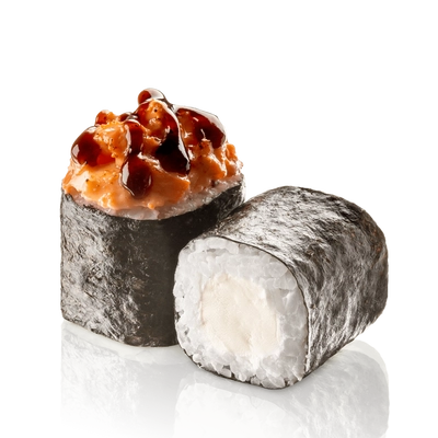 Лосось, сливочный сыр, икра тобико, майонез, соус унаги, нори, рис заправленный