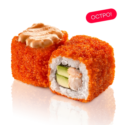 Креветка, сливочный сыр, авокадо, масаго, соус маракуйя, соус шрирача, авторский кунжут кимчи, микрозелень, нори, рис заправленный
