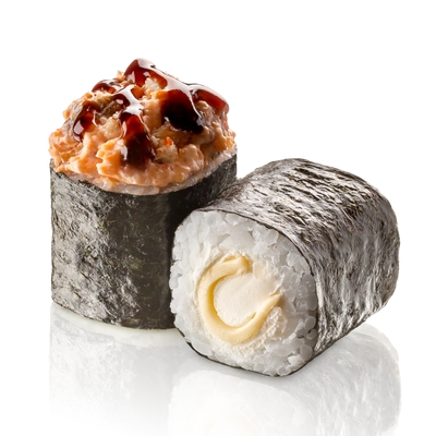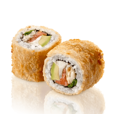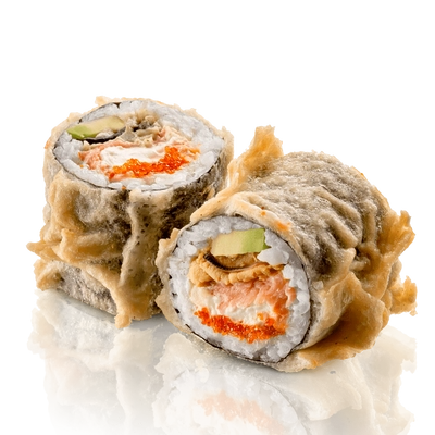 Лосось, угорь, сливочный сыр, авокадо, зеленый лук, сухари панко, нори, кляр, рис заправленный