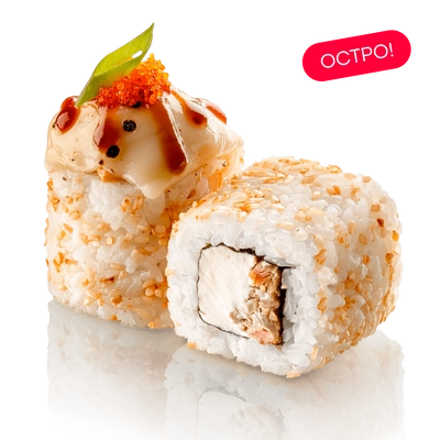 Курица, сливочный сыр, грибы шиитаке, икра тобико, майонез, фирменный соус том ям, кинза, сухари панко, кляр, нори, рис заправленный