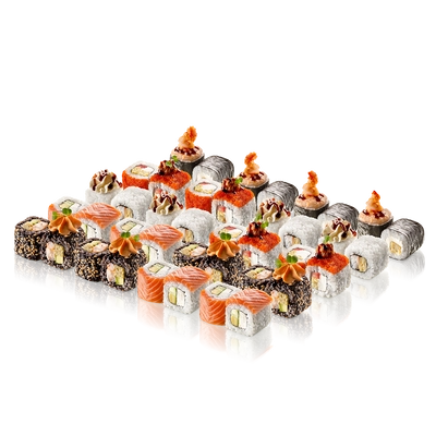 Блек ролл с лососем, креветкой и опаленным авокадо / Тартар ролл с лососем и шиитаке под соусом спайс / Майами / Венеция